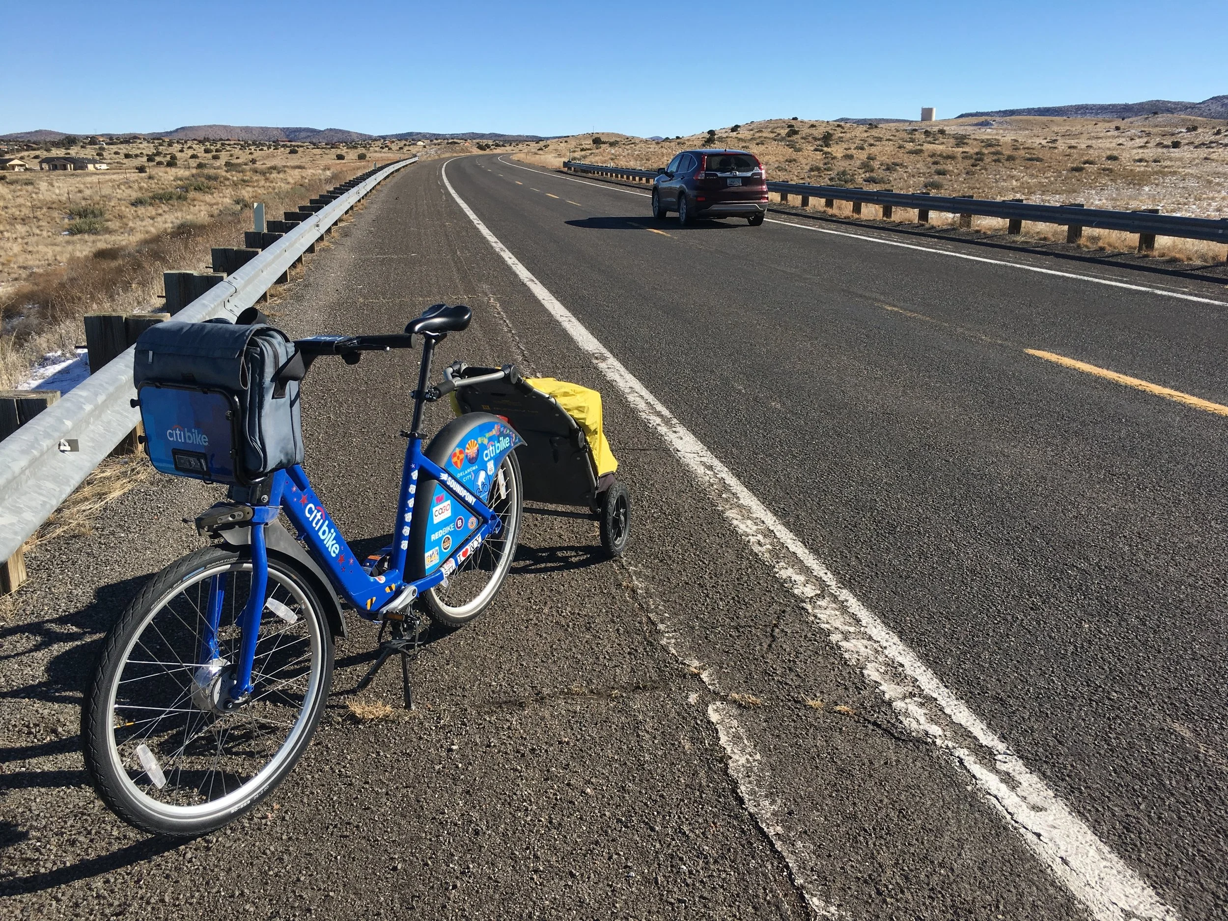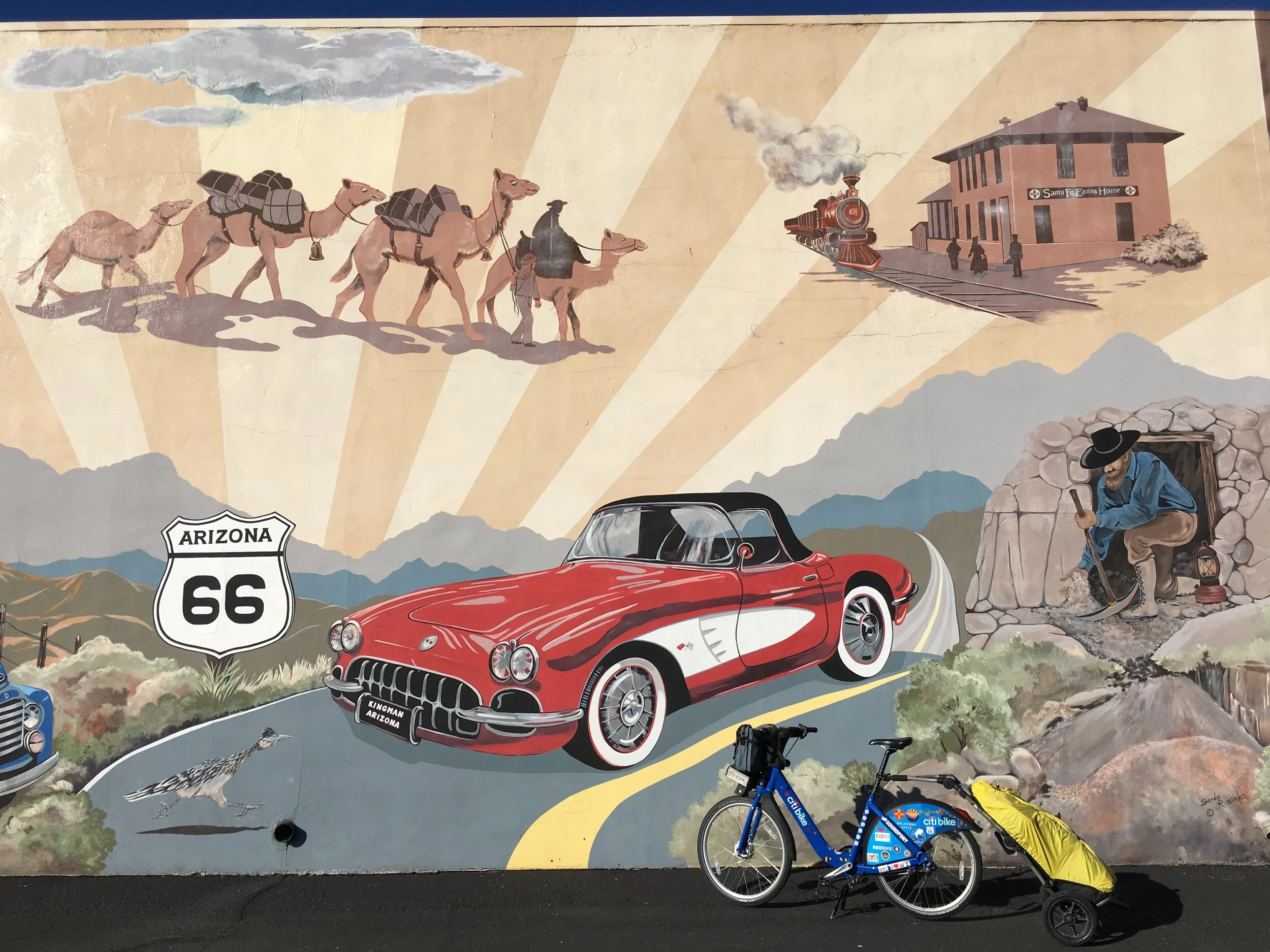 His accented English gives an intellectual quality to his questioning, which bewitches me enough to answer truthfully. I, too, am curious at what I’ve encountered: a man on a kid’s bike going the wrong way along a busy road on the outskirts of Kingman, Arizona with an uncovered hot beverage. As if reading my mind, he tells his story.