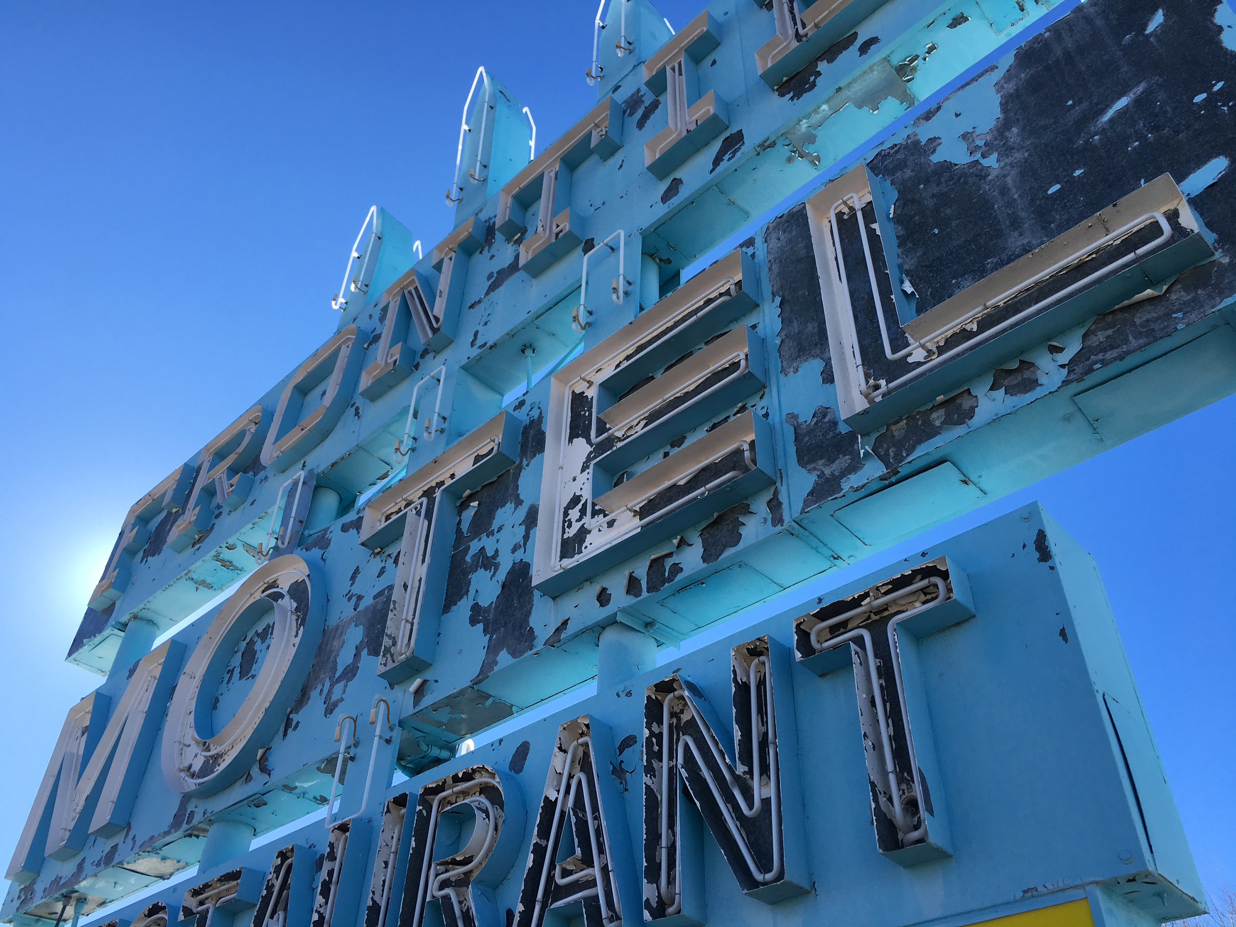 Breakfast is included, but coffee is not because the water line is frozen. Eating in the Betty Boop room that overlooks the empty parking lot, my toes begin to numb and I’m not even outside yet. The cobalt blue sky looks cold to the touch.