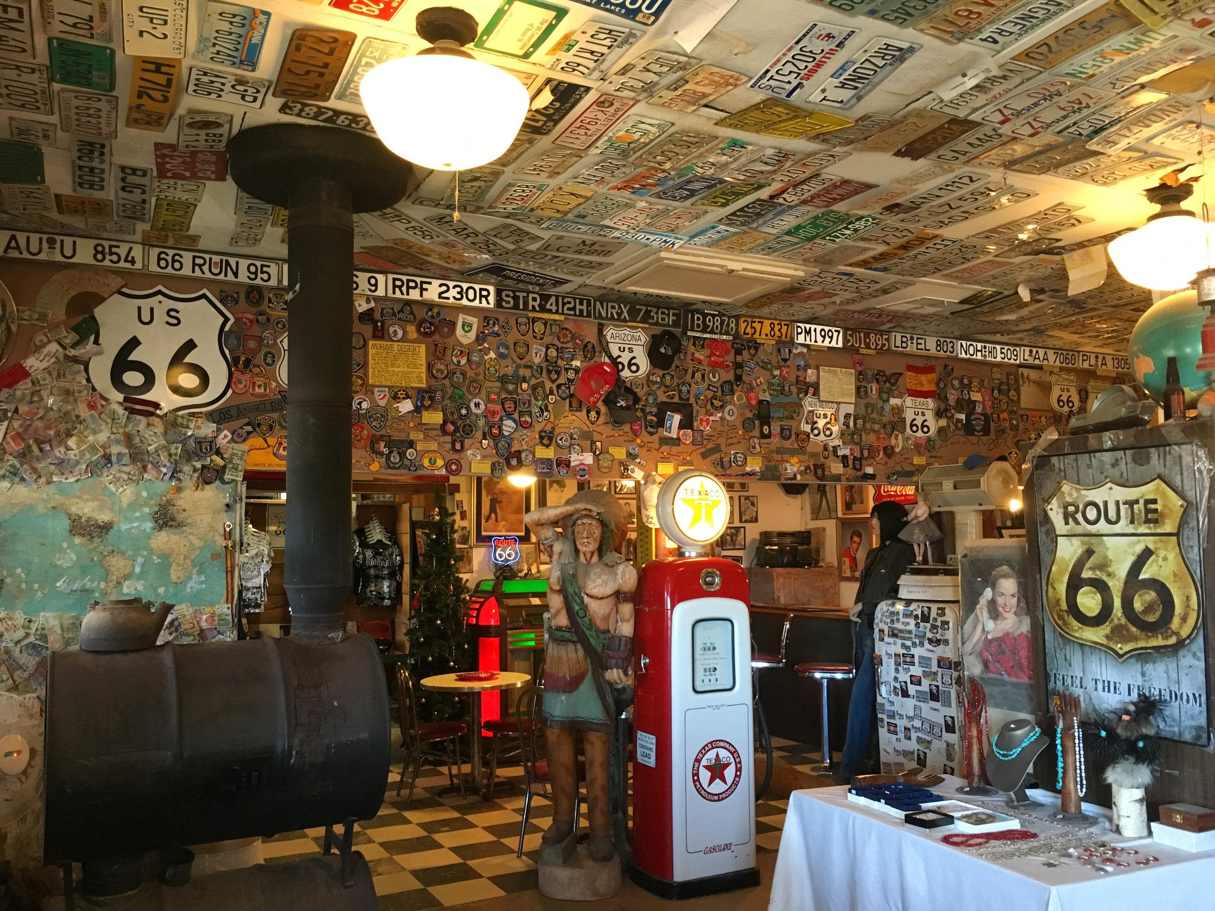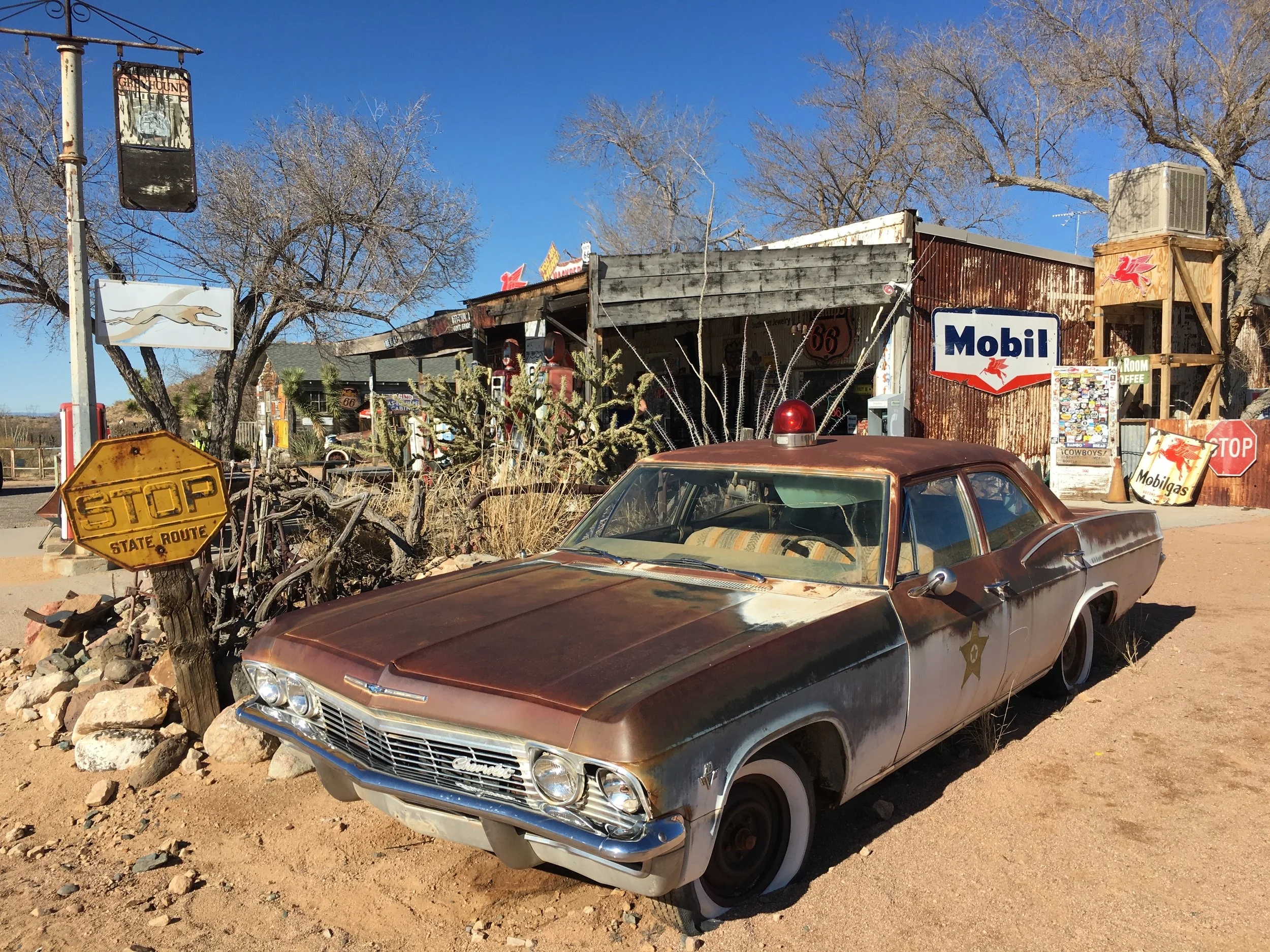 The general store has survived since the 1930s. How it stays in business is beyond me because it no longer sells gas, but rather vends soda, candy and Route 66 merch. Not a stable diet for financial success, but every Route 66 tourist stops here to poke around the vintage car graveyard with old advertising signs.